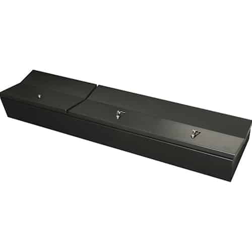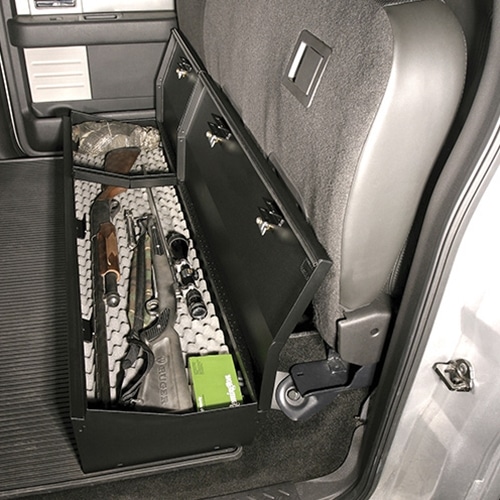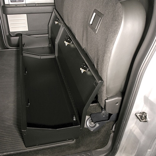 This high security welded steel security lockbox mounts under the rear seat in an F150 Crew Cab without the subwoofer. The full width formfitting design of the Tuffy lockbox has over 4000 cubic inches of lockable storage. It’s secured contents are easily accessed by flipping either or both of the rear seats up and opening the corresponding lids. The unique design allows the full width to be used to stow firearms or other long items. The innovative mounting system only accessed from inside the box when unlocked allows the entire lockbox to be removed in seconds, without the need for any tools, when extra floor space is needed or to store the lockbox and locked contents in an alternate location. Featuring Tuffy’s Pry-Guard Locking System with a 10 tumbler double bitted security lock with built in weather seals. Mounts inconspicuously under the seat out of apparent site of would be thieves. Is quickly and easily installed using the factory hardware without drilling.